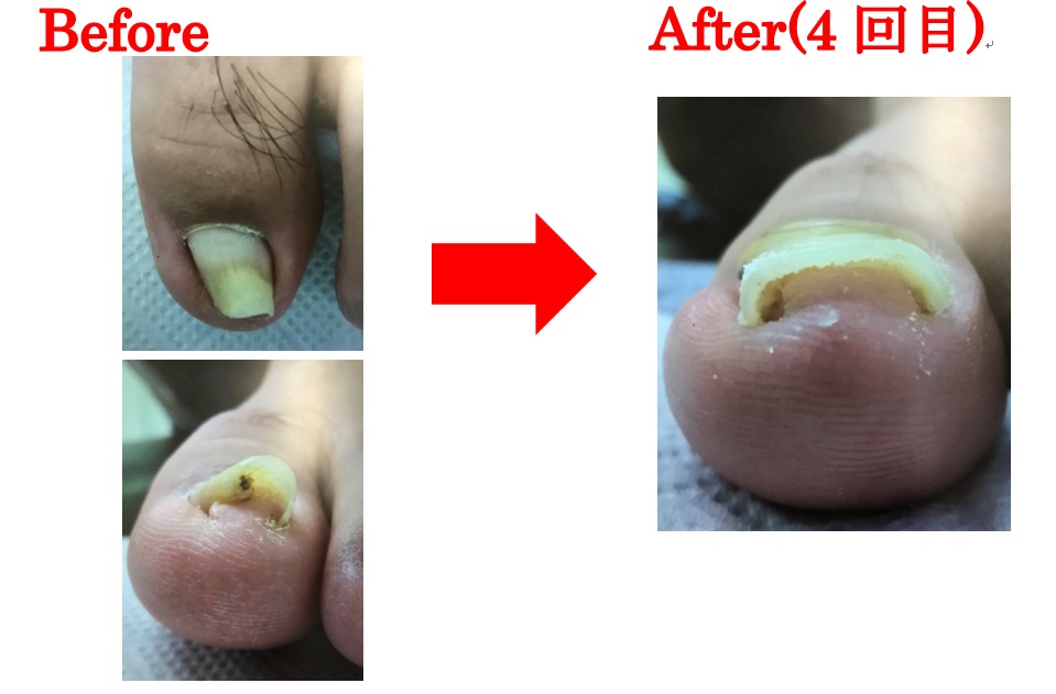 爪が上を向いてかなり巻いている状態でしたが、4回目には巻き爪が解消されました。
