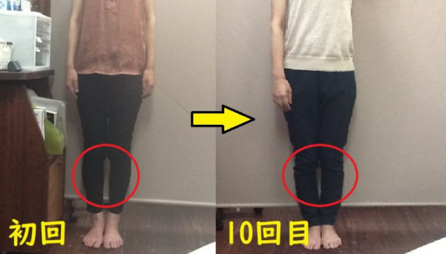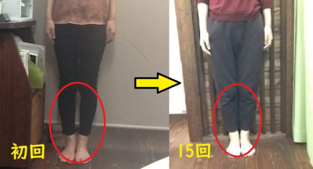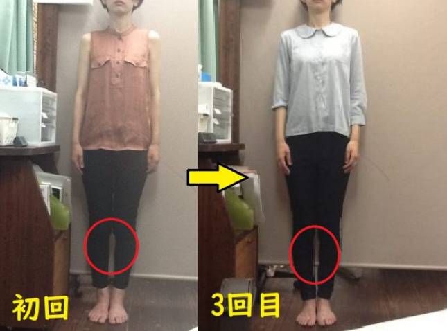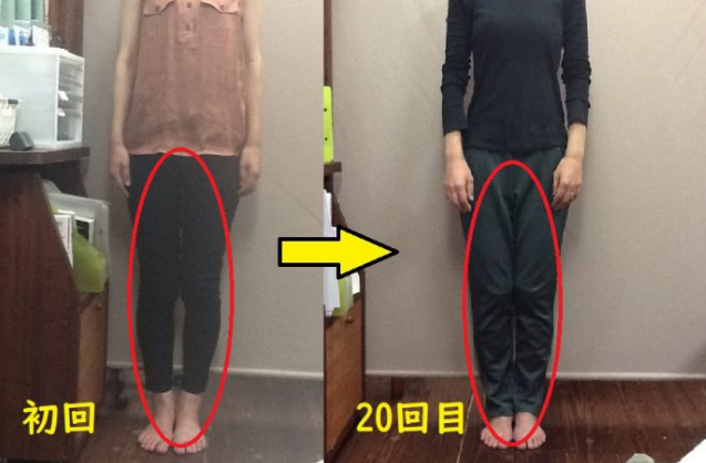 3回目だけでも右に傾いていた重心が真ん中によって、膝下の隙間が狭まったのがわかります。O脚の人の足を矯正すると姿勢やバランスが良くなります。O脚の人は基本的に立ち方や座り方、歩き方などの姿勢が悪く体が傾いている人が多いのです。