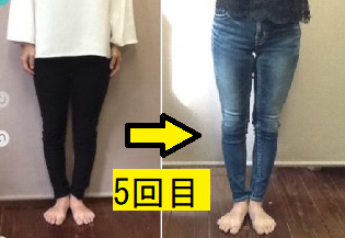 5回目は足のラインが細く見えてきています。ただこの方の場合左に体が傾いていますが、これは重心のかけ方の問題。大体、O脚の方は体のバランスも悪いのでこのような傾きを伴う方もいらっしゃいます。