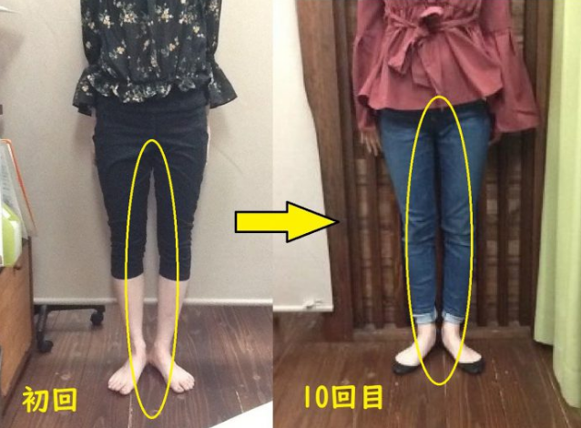 10回目には綺麗なラインで立てているのが分かります。膝下がきゅっと締まって見えるので腿から足までのラインが美しく見えます。当店では体のバランスや歪みを取りながらお客様と一緒に体本来の力と、姿勢を取り戻していくのがポイントになります。