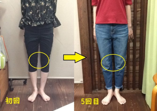 5回目までの施術です。膝の隙間が狭くなっているのが見て取れます。O脚の矯正をしていくと足の隙間はもちろんのこと足自体が逆三角形になっていくので遠目から見て綺麗に見えてきます。