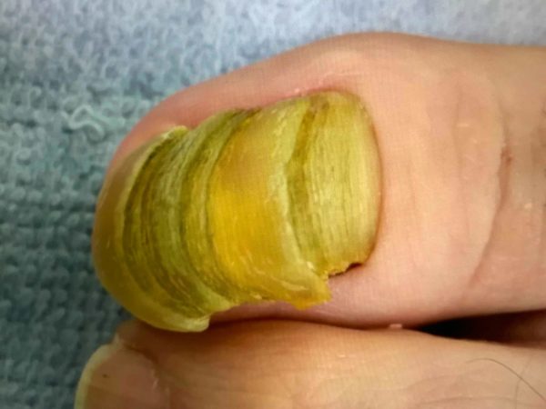 さらに特徴的なのが、爪が鉤型に弯曲していきます。その結果として爪が何層にもなり、カタツムリの殻のように爪が膨らみ、場合によっては爪が横に生えていってしまうこともあります。