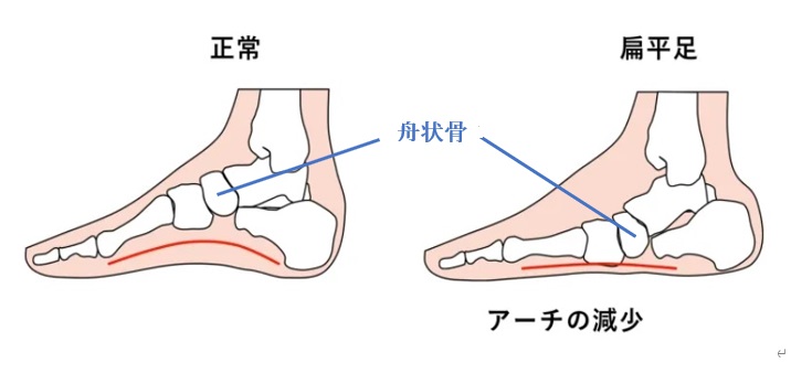 この骨が、足底側に落ちてしまうことで、アーチが崩れる為偏平足になります。
