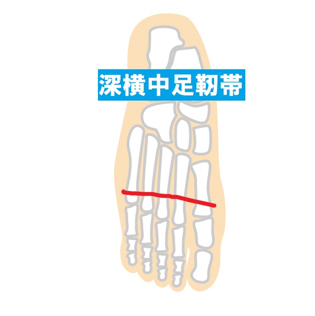 中指と薬指の間は構造上神経が合流して太くなっているので痛みが出やすい場所になります。この場所に深横中足靭帯という隣同士の指を繋ぎとめている靭帯があります。その下に神経が走っているためこの靭帯に負荷がかかり下の神経や神経の塊に圧迫がかかると焼けるような痛みがでるのです。