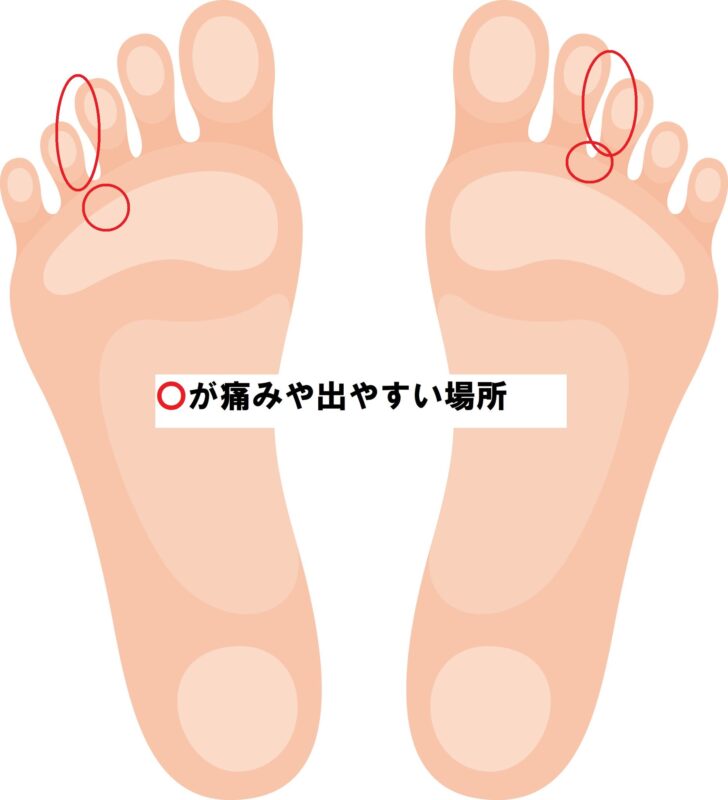 歩きすぎや、ヒールなどを履くことで指の間に負担がかかり神経を圧迫することで発症します。指と指の間に神経種と呼ばれる神経の塊のようなものができてそこに痛みを生じます。また神経種と言っても腫瘍ではない仮性神経種です。