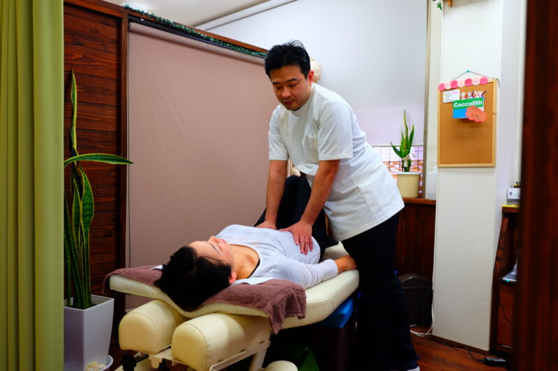 当店では独自のトントン整体法と言う、軽くトントンと指で叩くことにより振動を深部に送り深い所の血流を改善する方法で施術しています。