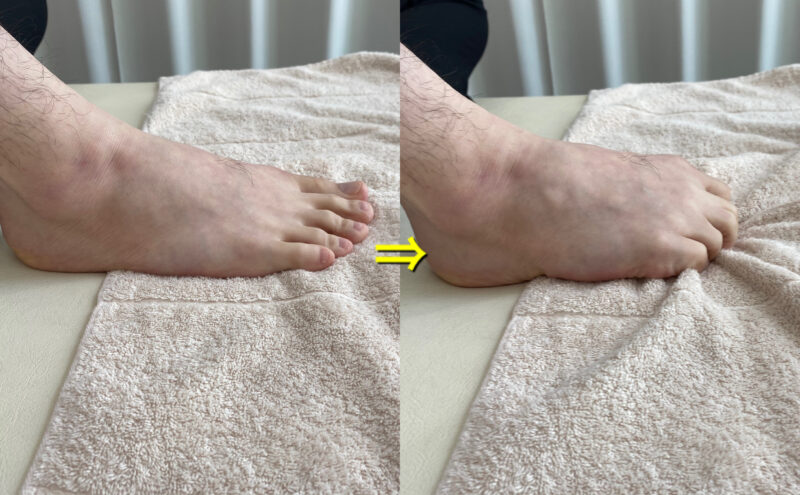 次にタオルギャザーと言ってタオルの上に足を置いてタオルを指で手繰り寄せるように指先で掴みます。これを1日3~5回行います。
