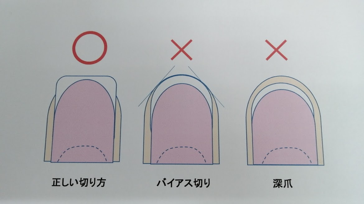 まず、間違った爪の切り方は、爪の角を斜めに切る「バイアスカット」と「深い爪」です。どちらも巻き爪の原因になります。