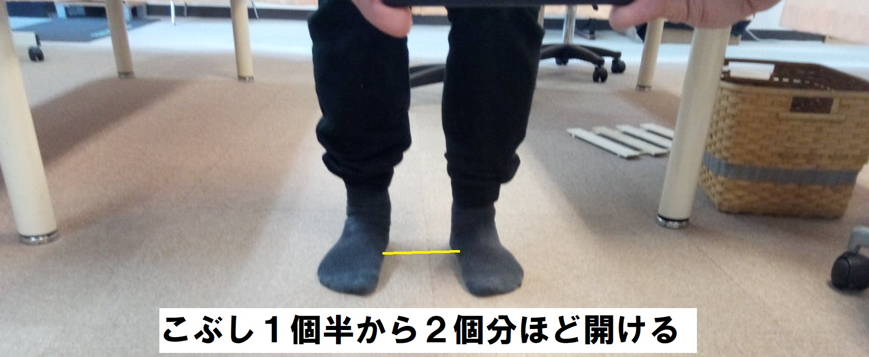 ①足をこぶし1個半から2個ほど空けて立ちます。