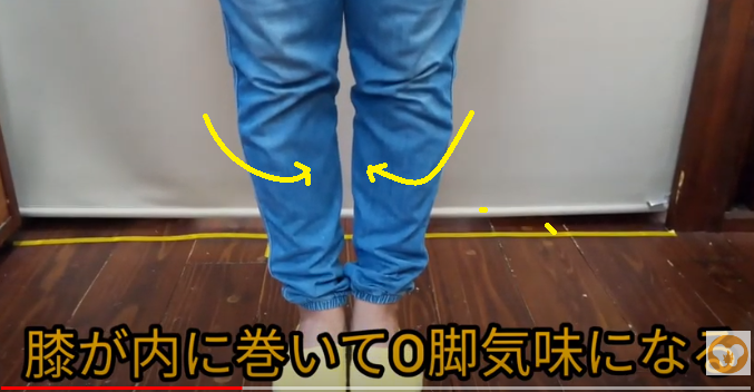 すると下の写真のように膝が内向きになり、O脚を助長する形になります。