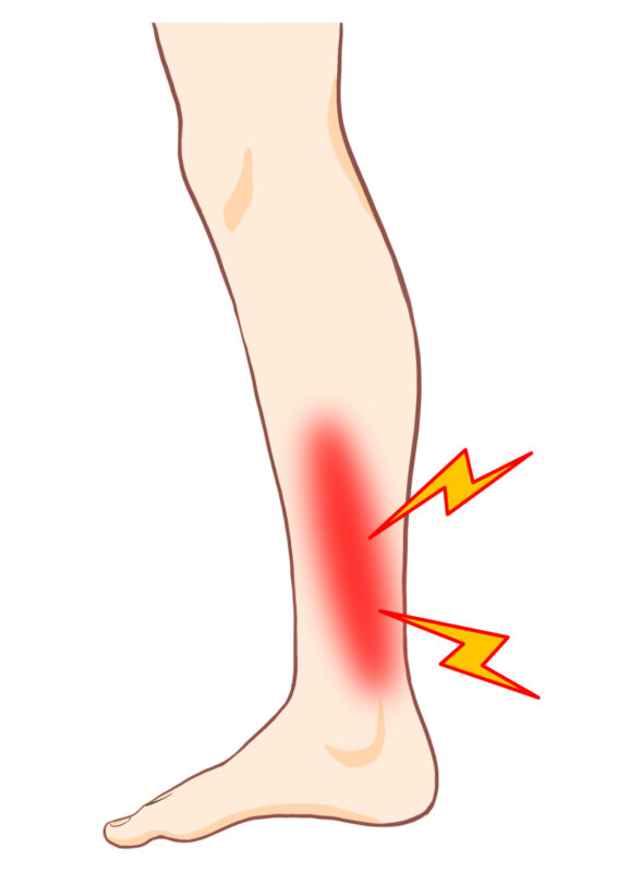 テニスをしている最中や終わった後に下腿の内側、すねの内側に痛み、圧痛、腫脹が出ます。