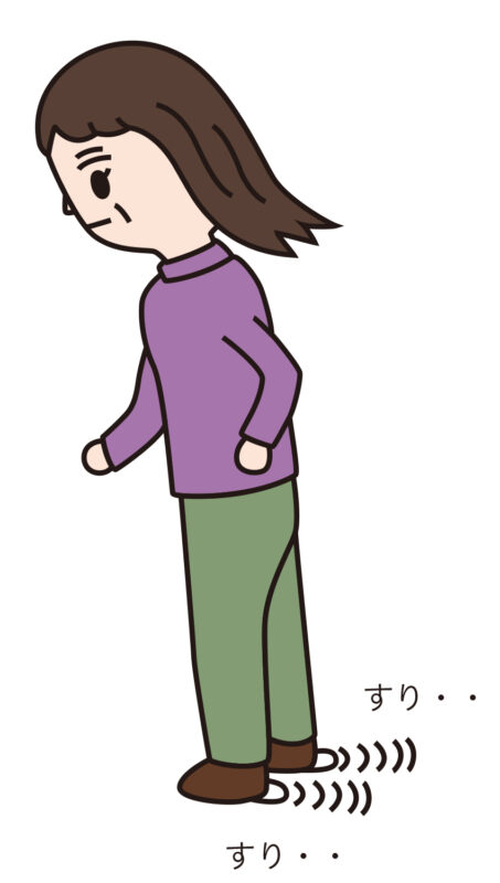 普段の歩き方が足の指をしっかり使えていないような「ペタペタ歩き」や「どすどす歩き」、足の裏を擦って歩くような歩き方の場合も足の筋肉の機能が低下し、回内足に陥ります。