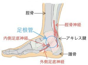 何かしらの原因でこの「足根管」が圧迫されて足に痛みやしびれがでた状態を足根管症候群といいます。