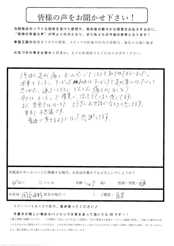 お客様の声 アンケート、足・膝・足首などの痛み・しびれ