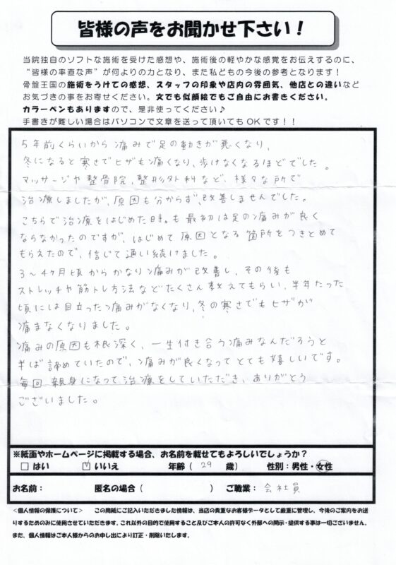 お客様の声 アンケート、足・膝・足首などの痛み・しびれ