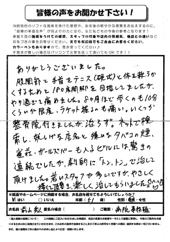 股関節と手首をテニスと体を軟らかくするために来院しました