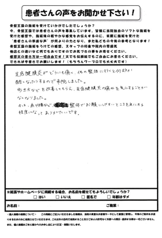 お客様の声 アンケート、足底筋膜炎