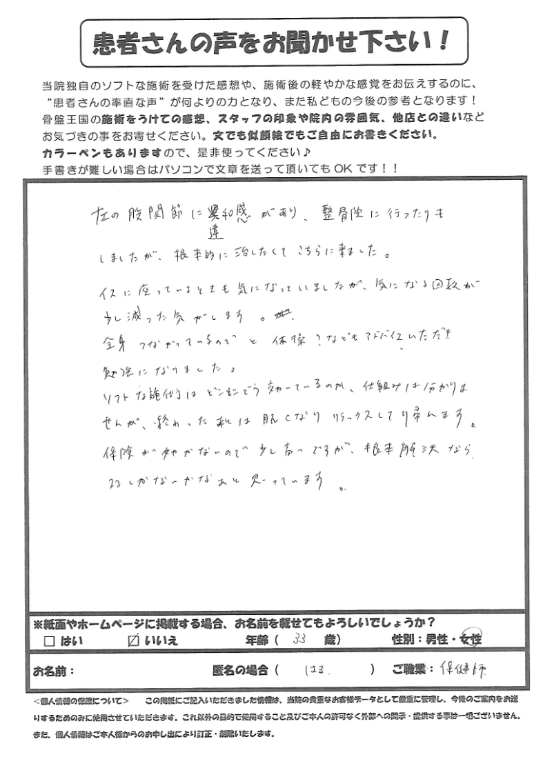 3. 左の股関節の違和感に悩んでいたけど根本から解決できそう。(33歳女性)