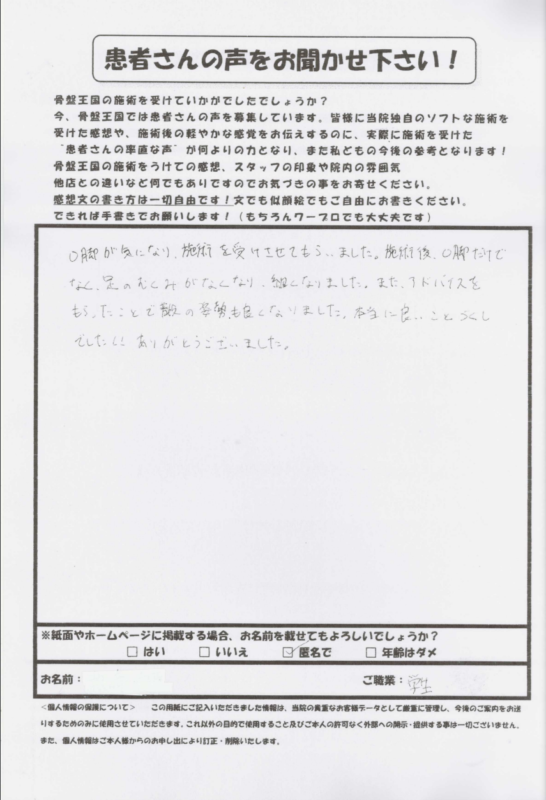 3. O脚で来院しましたが浮腫みなどもなくなりました!