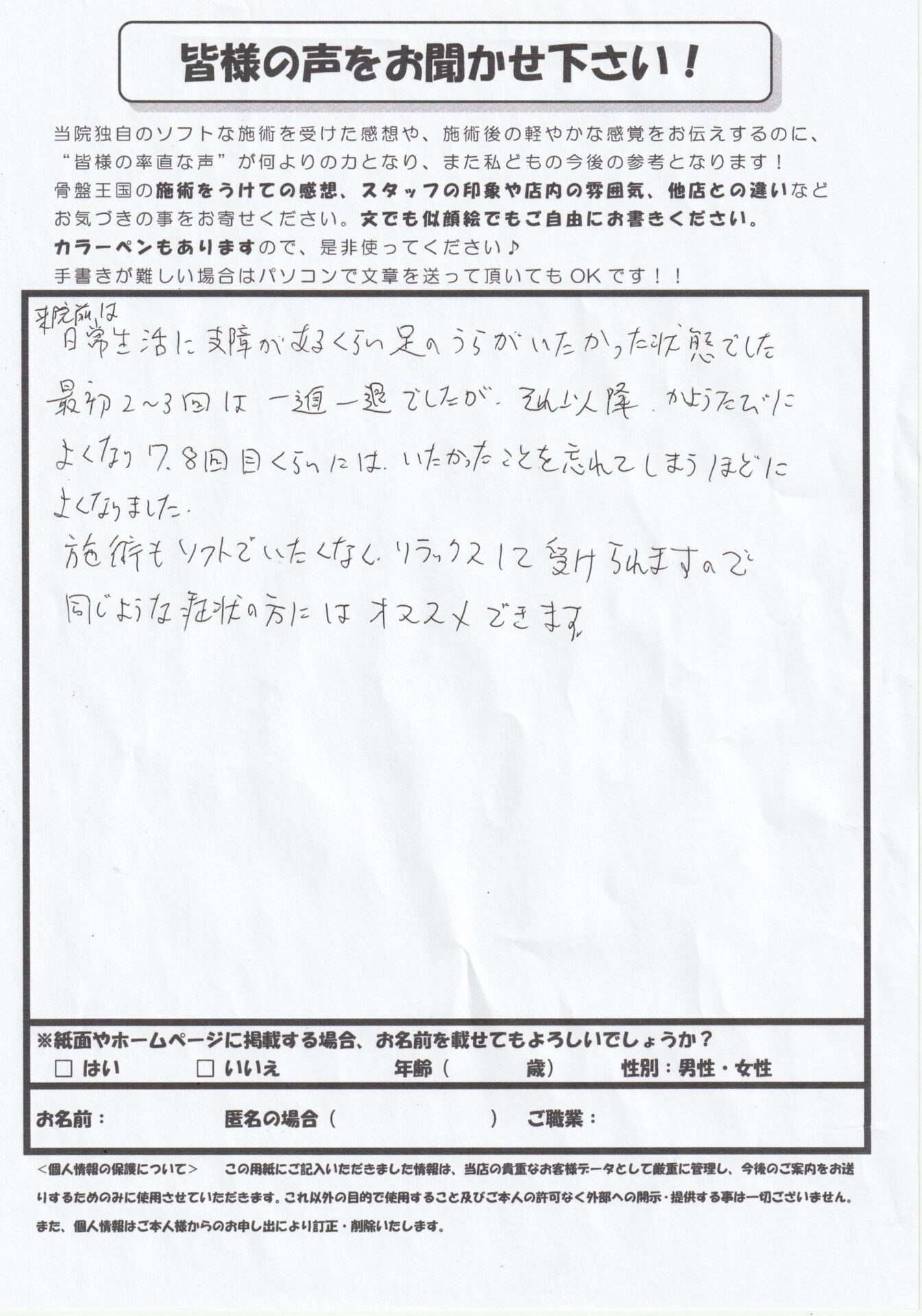 ソフトでリラックスできる施術で、足裏の痛みを忘れてしまうほど良くなりました