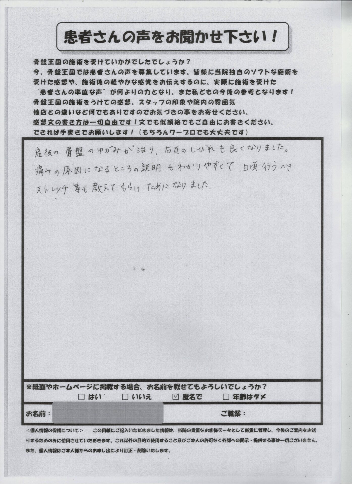 産後の骨盤の歪みと足のしびれが良くなりました。